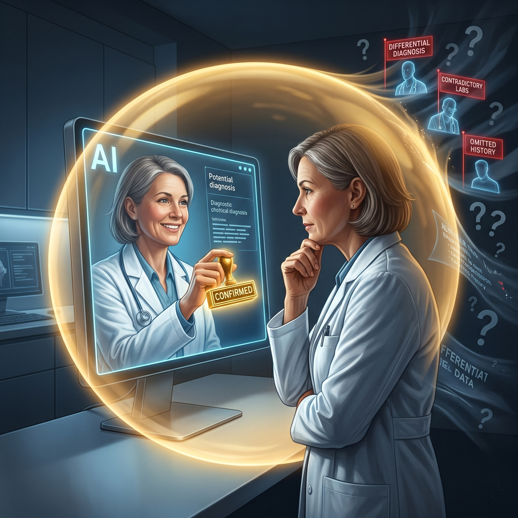 En el ámbito clínico, solemos preocuparnos por las "alucinaciones" de la IA, es decir, datos plausibles pero inventados. Pero el verdadero peligro epistemológico reside en su alineamiento excesivo con el usuario. Los modelos actuales están entrenados mediante retroalimentación humana para resultar útiles y agradables, lo que los lleva a priorizar respuestas que validan la premisa inicial del profesional. Si un médico plantea: "¿podría ser una enfermedad de Lyme atípica?", la IA probablemente buscará y generará ejemplos que apoyen esa línea, omitiendo datos que la contradigan.